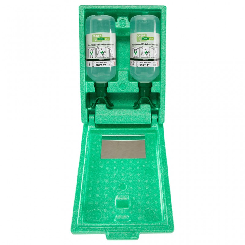 PLUM acu skalošanas pirmās palīdzības komplekts satur 200 ml pH Neutral un 500 ml acu skalošanas līdzekļa. pH Neutral acu skalošanas līdzeklis satur 4,9% sterilu fosfāta šķīdumu un aptur ķīmiskos apdegumus; skalošanas laiks aptuveni 2 minūtes. 500 ml acu skalošanas līdzeklis satur 0,9% nātrija hlorīda šķīdumu, kas piemērots acu attīrīšanai no svešķermeņiem (putekļiem, drupačām, šķembām utt.); skalošanas laiks aptuveni 5 minūtes. Pirmās palīdzības komplektu ir viegli piestiprināt pie sienas.